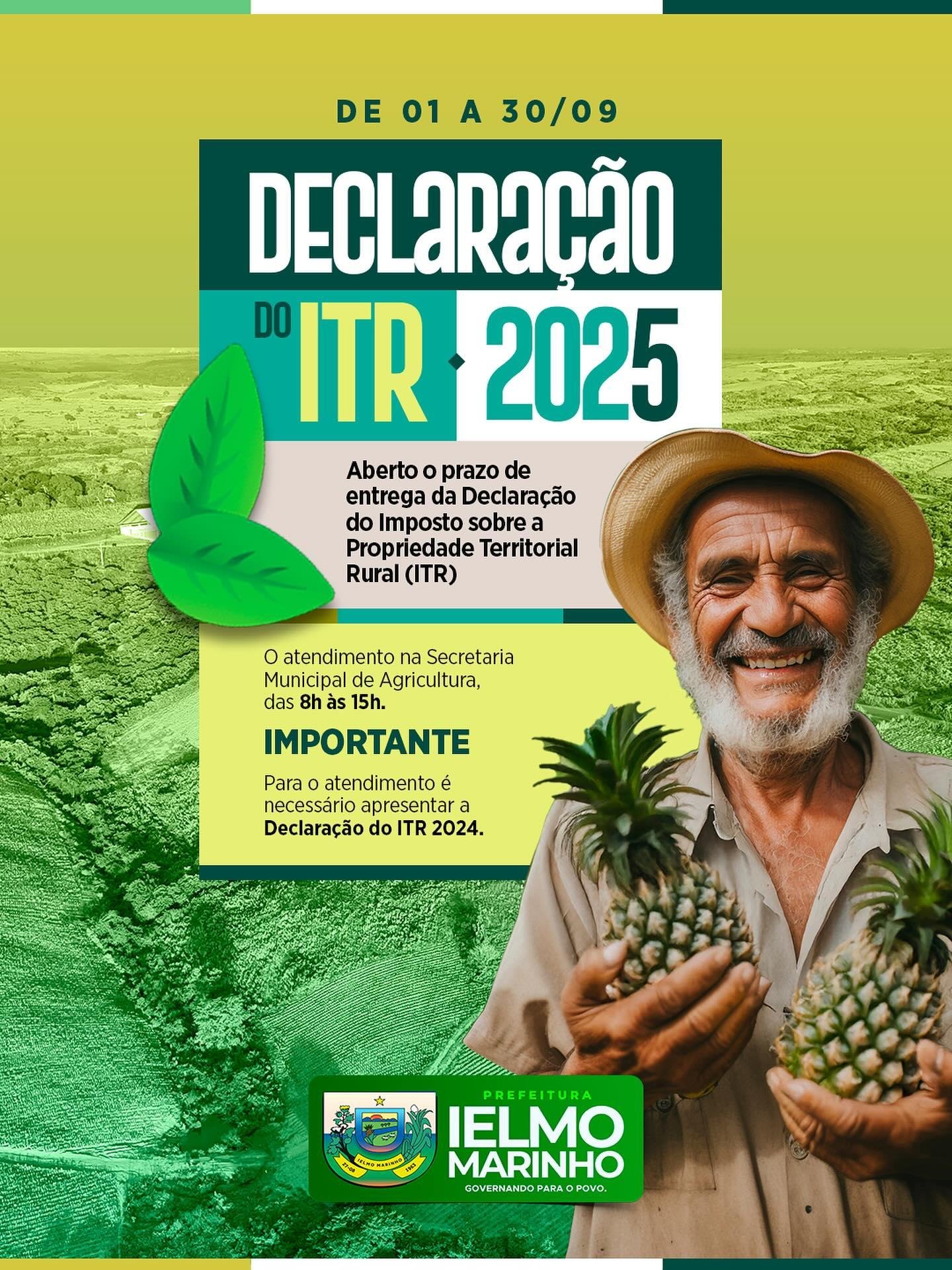 De 01 a 30 de setembro está aberto o prazo para a Declaração do ITR 2025 (Imposto sobre a Propriedade Territorial Rural). O atendimento acontece na Secretaria Municipal de Agricultura, das 8h às 15h.