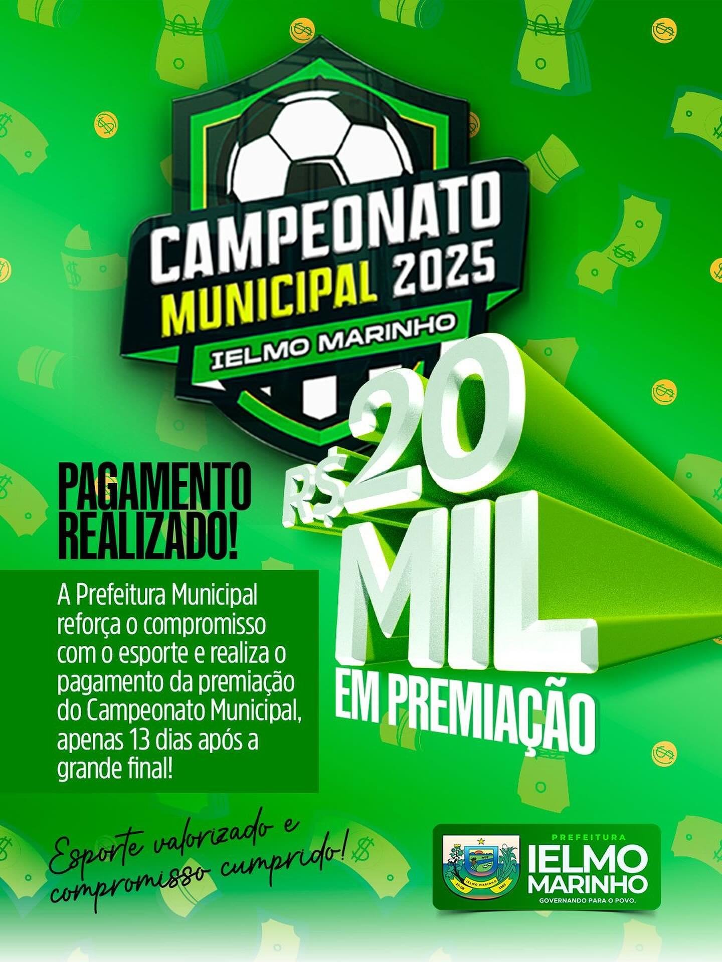 A Prefeitura Municipal realizou, nesta sexta-feira, o pagamento da premiação do Campeonato Municipal, totalizando R$ 20 mil em prêmios — apenas 13 dias após a grande final.