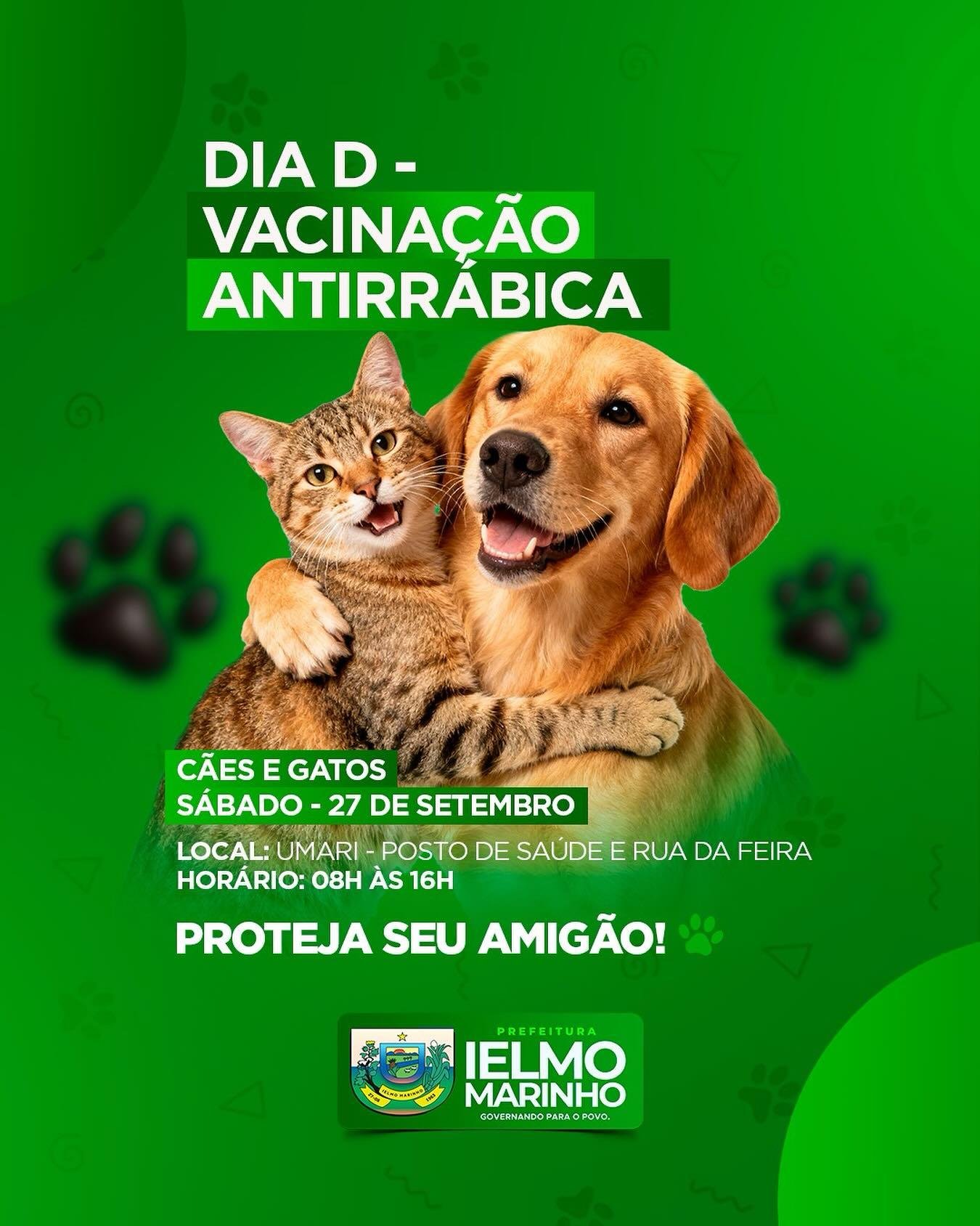 A Prefeitura Municipal de Ielmo Marinho convida todos os tutores para o Dia D de Vacinação Antirrábica, que acontece neste sábado, 27 de setembro, em Umari, no Posto de Saúde e na Rua da Feira, a partir das 08h.